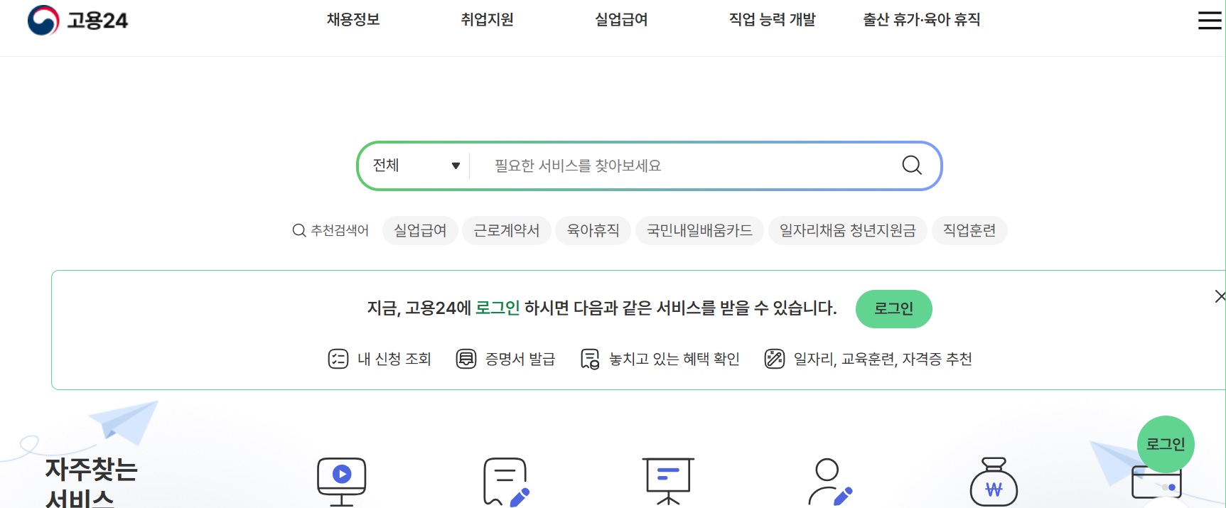 지금, 고용24에 로그인 하시면 다음과 같은 서비스를 받을 수 있습니다. 로그인 닫기 지원 제도 취업과 관련한 다양한 지원 제도를 소개해 드립니다. 아래에서 궁금하신 주제를 클릭해 주세요.