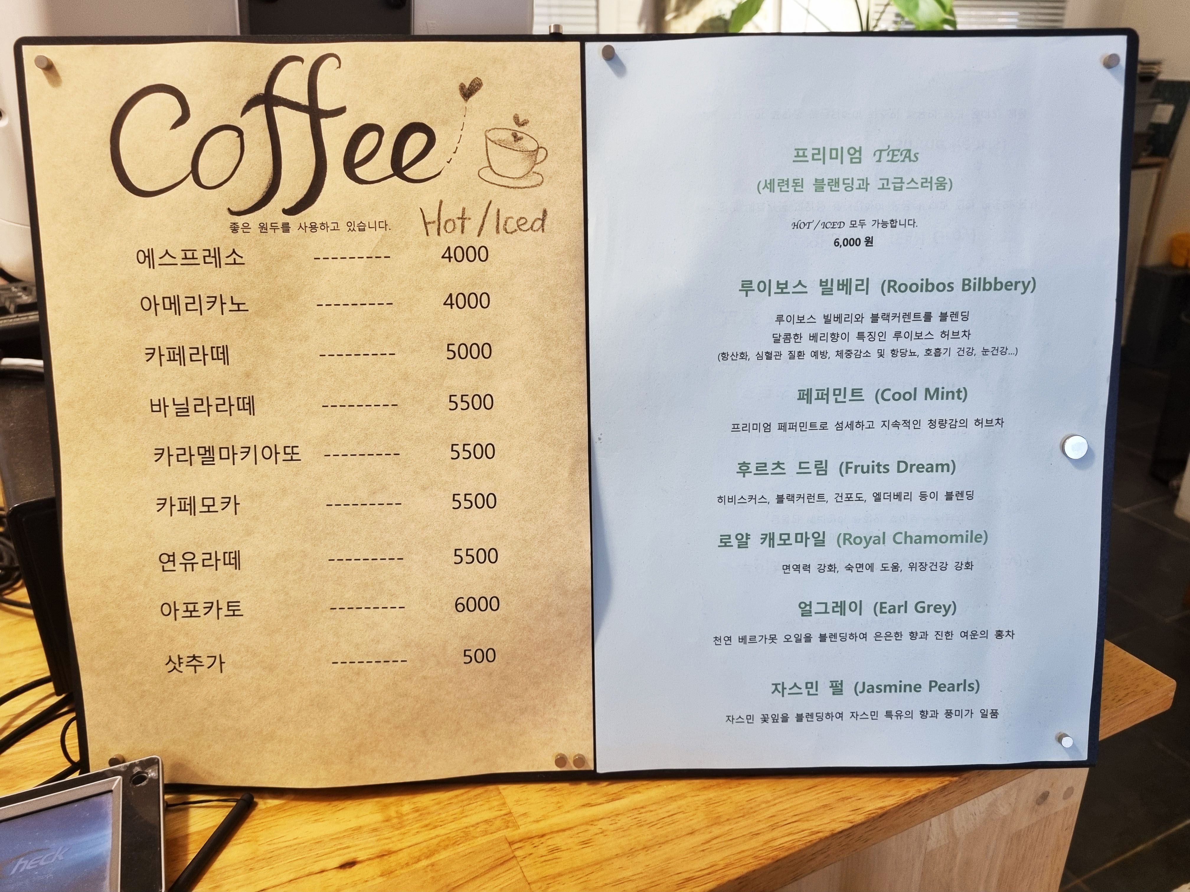 커피메뉴와 프리미엄 티 메뉴가 있는 오월의 숲.