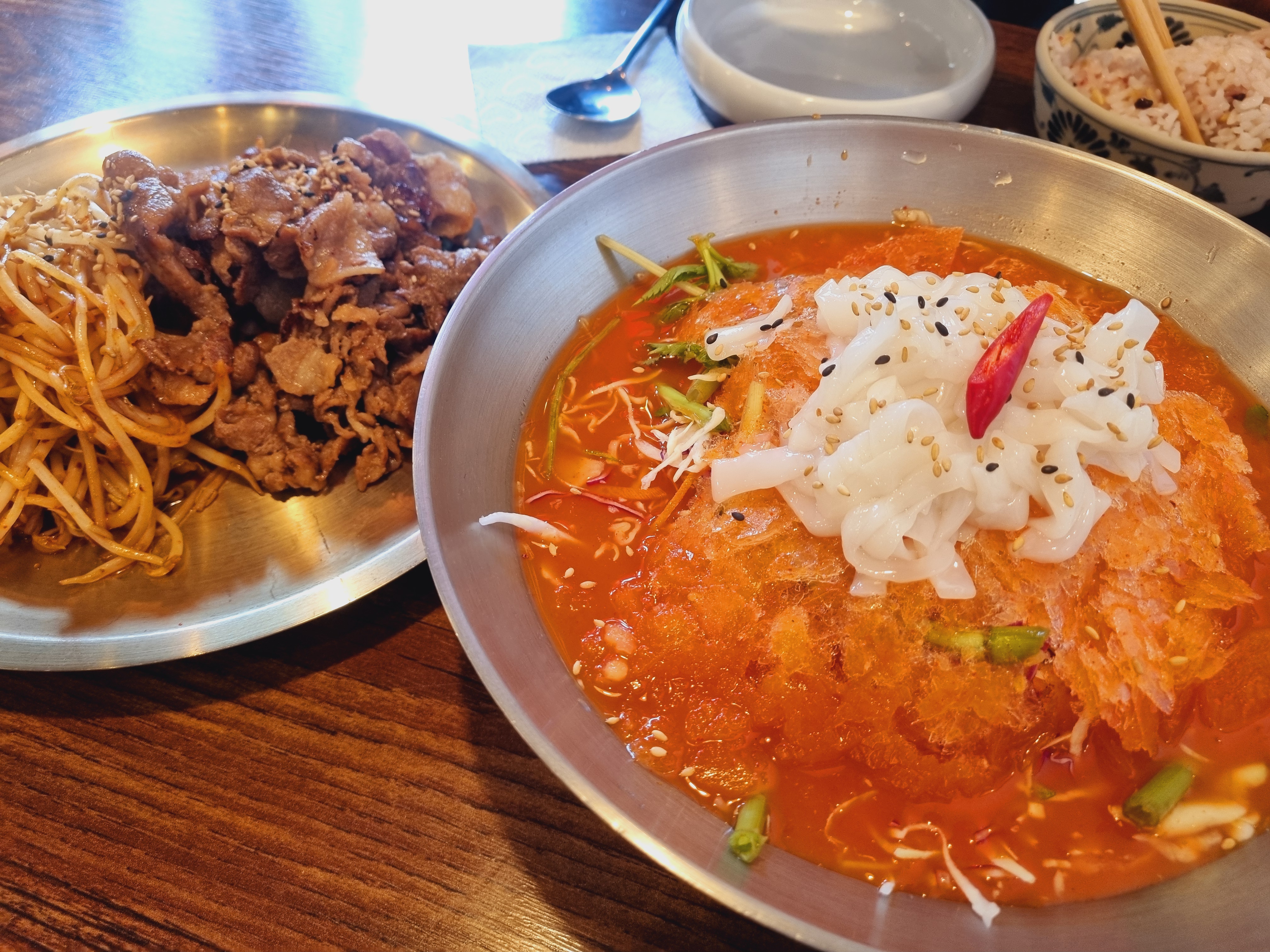 한치가 올라간 너무나도 시원한 물회국수. 그리고 정말 맛있는 돼지불백!!!