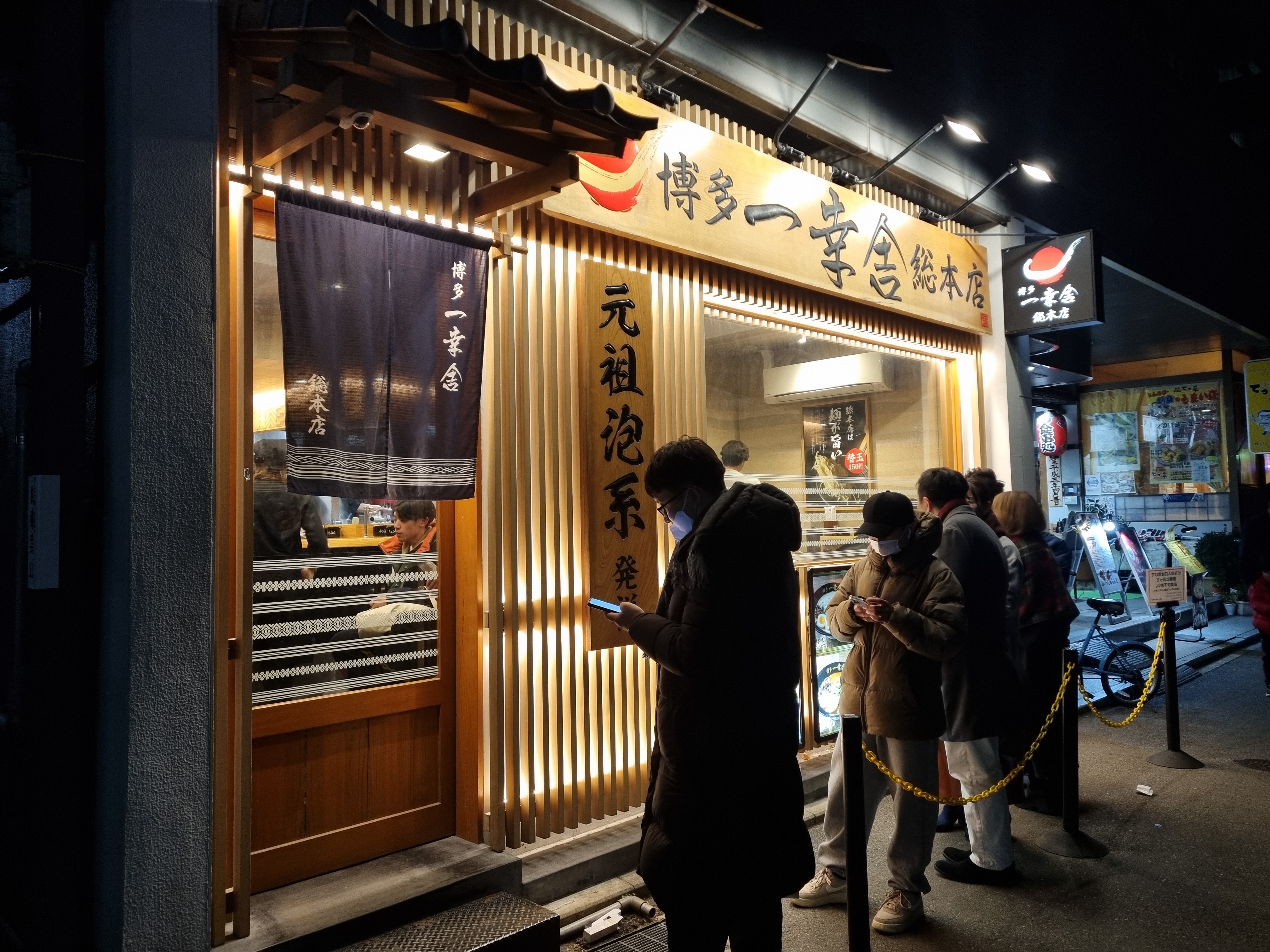 늦은 저녁 식사 중인 사람들로 가득찬 하카타잇코샤라멘